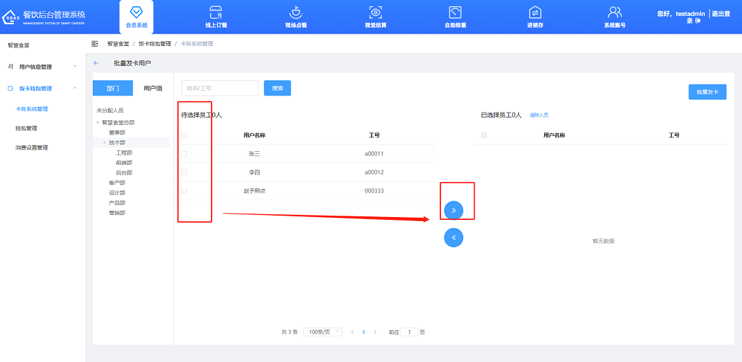 ②在部門、用戶主或者自行添加的組類選擇需要添加的人員(或者通過搜索框搜索需要添加的人員),勾選用戶名稱的前面的選項,點擊“箭頭”按鈕,移動到右邊(若不需要,可點擊“清楚人員”按鈕移除選項),再點擊“批量發卡”進入下一個“計出配置”彈窗;