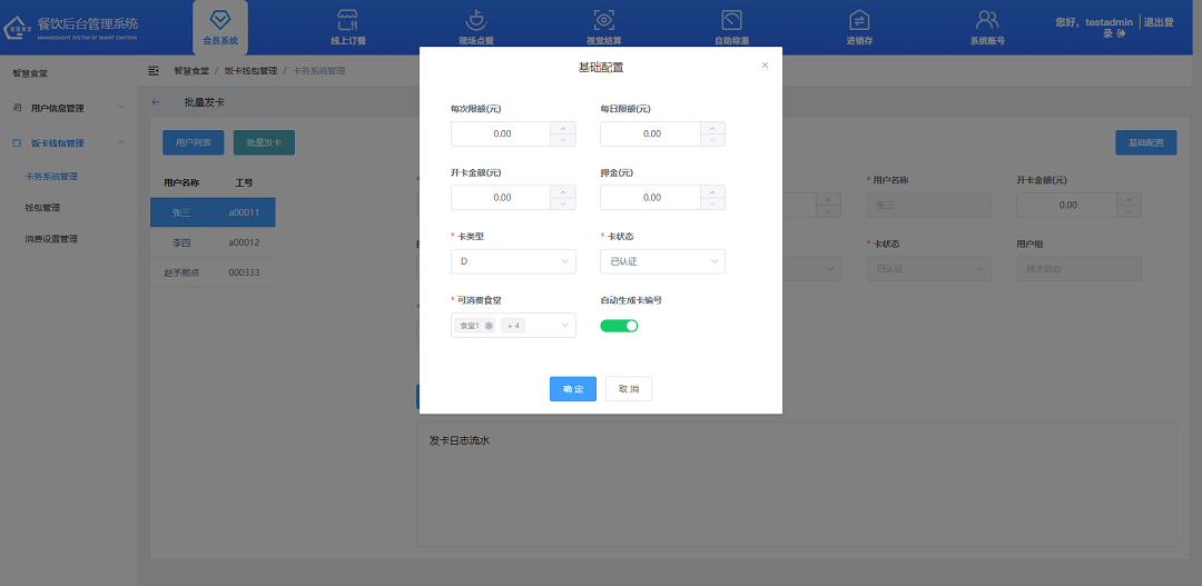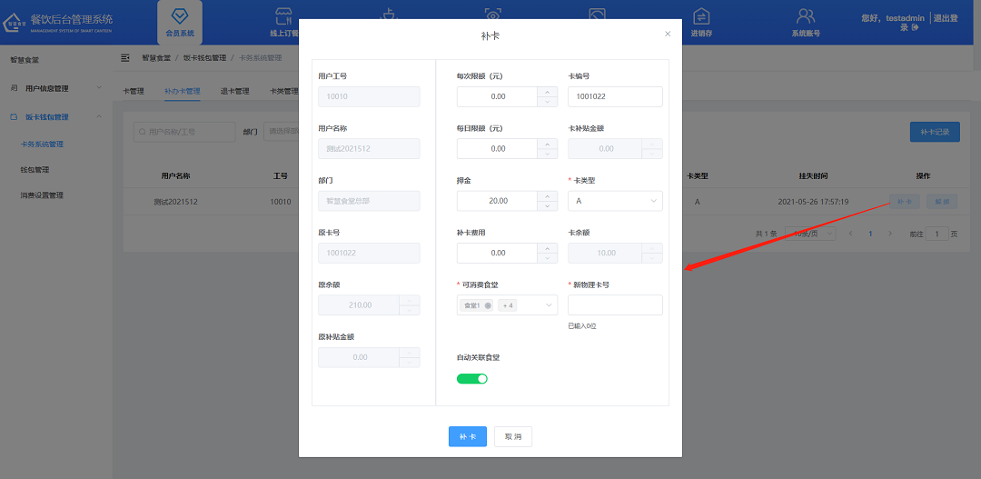 ②設置用戶的每日限額、卡編號、每日限額、押金、補卡費用、新物理卡號;選擇卡類型、可消費食堂;設置是否自動關聯食堂;
