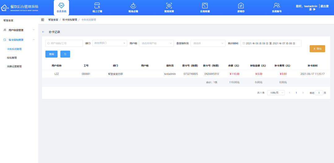 ①輸入用戶名稱/工號、選擇部門,點擊查詢,便可快速查詢某個卡號