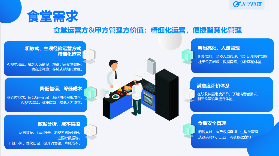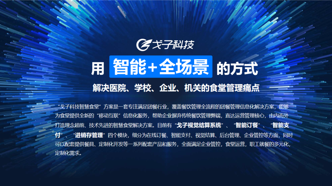 戈子科技是一家集研發(fā)、銷售、生產(chǎn)和服務(wù)于一體的高新技術(shù)企業(yè),致力于為團餐行業(yè)提供科學(xué)、高效的智慧食堂全場景解決方案!