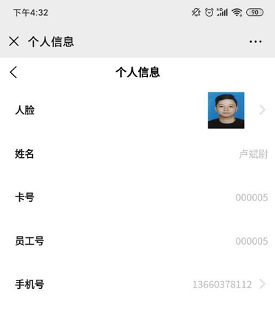 ①可查看人臉、姓名、卡號、員工號、手機號等信息