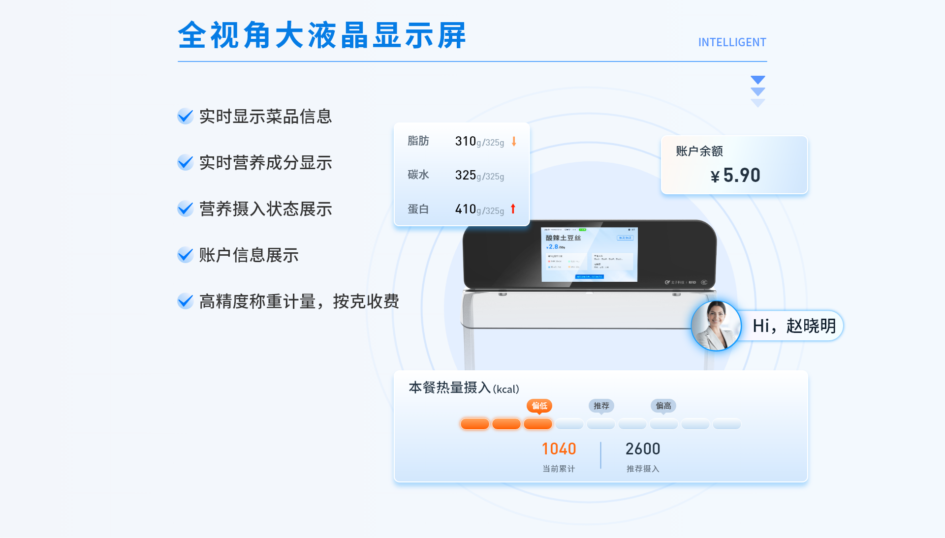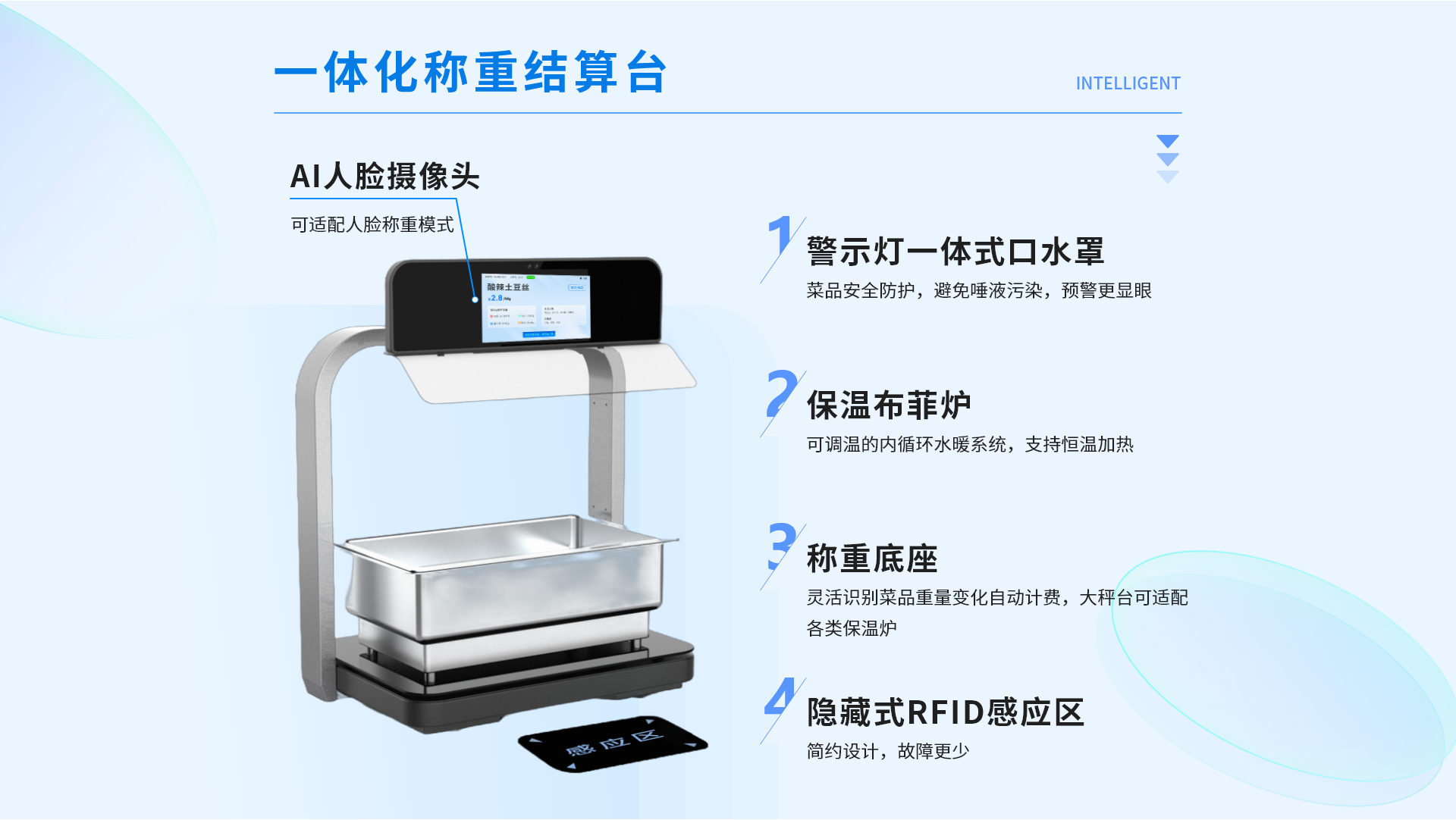智能稱重結算臺一體化設計,基于餐飲云平臺為就餐者提供的無感支付、自助餐飲的智能化集成式系統。用戶綁定托盤后,通過托盤感應臺讀取托盤信息,即可在多個智能秤上自助稱重取餐,取餐完成后通過空中支付進行就餐結算。